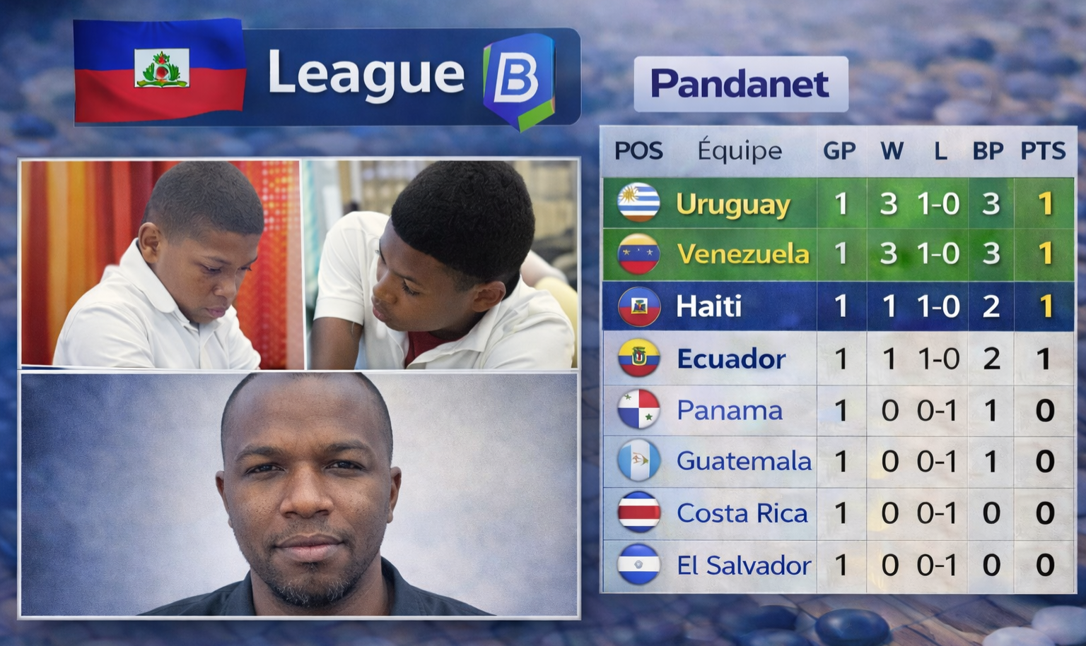 Pour la saison 2026 de la Pandanet Go Latin American Team Championship, Ligue B, l’Uruguay est en tête, suivie de près par le Venezuela et justement Haïti qui se classe à la 3e marche de l’escalier. Les classements évoluent au fil des rondes, et la seconde partie est prévue pour le 22 février où l’équipe nationale affrontera le Venezuela.