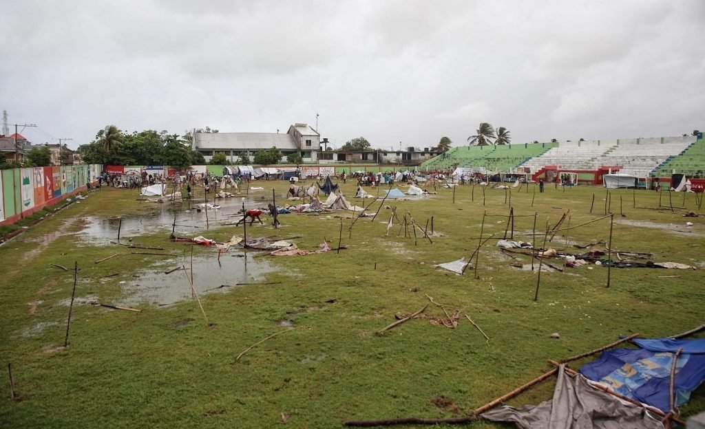 Le Land des Gabions est devenu donc depuis le dimanche 15 août, un important site d’hébergement où vivent actuellement plusieurs familles dans des conditions difficiles : tentes, bois, bâches, morceaux de maillots ou de pantalons, tout ce qui pouvait servir de protection pour les diverses familles abritées sont sur la pelouse du Land des Gabions, lieu généralement sacré pour accueillir les matchs de l’America des Cayes ou de la Juventus.